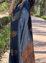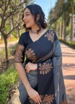 The Banarasi Silk Zari Woven Jacquard Saree is a graceful and timeless ensemble that exudes tradition and elegance. Crafted from luxurious Banarasi silk this saree showcases intricate Zari weaving in traditional jacquard patterns adding an air of regal sophistication. The rich grey hue of the saree is complemented by the shimmer of gold and silver Zari accents making it a perfect choice for festive occasions and cultural celebrations.