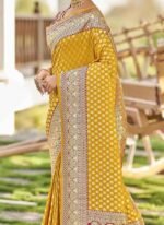 Adorn yourself in the epitome of elegance with this resplendent yellow saree exquisitely crafted to captivate hearts and turn heads. Crafted from luxurious art silk its vibrant yellow hue evokes a sense of joy and radiance perfect for any celebratory occasion. The saree is adorned with intricate Benarasi zari and jacquard work showcasing a harmonious blend of traditional craftsmanship and contemporary allure. The golden motifs delicately woven into the fabric add a touch of regal splendor elevating its allure to new heights. Contrasting the sunny yellow backdrop delicate pink accents grace the saree creating a captivating visual contrast that accentuates its beauty. The subtle yet striking floral and motif work in pink further enhances its charm adding depth and dimension to the ensemble. Completing the ensemble is a meticulously tailored blouse in matching pink customdesigned to complement the saree flawlessly. Embellished with coordinating floral and motif work the blouse adds a touch of sophistication and completes the look with finesse. Indulge in timeless elegance and exquisite craftsmanship with this breathtaking ensemble a true testament to the timeless allure of Indian traditional attire. Whether its a wedding festival or any special occasion this ensemble is sure to make you the epitome of grace and style.