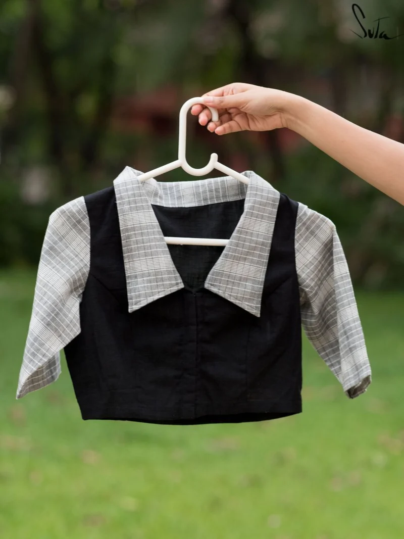 Home Blouse Black Cotton Elbow Sleeve Blouse With V Neck