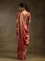 - Dark peach fendi satin silk saree is a contemporary statement piece designed to enhance your festive wardrobe with a unique shimmer and refined elegance. The fabric carries a textured sheen that drapes smoothly and creates a fluid silhouette. Highlighting its surface are detailed hand embroidered accents arranged across the pleats and pallu. These embellishments reflect traditional artistry in a very modern palette.