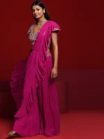 Our pink ruffled saree is crafted in sumptuous silk-blend fabric and features a short-sleeved blouse with a sweetheart neckline. Adorned with beaded accents and sequins, this style is perfect for festive celebrations.