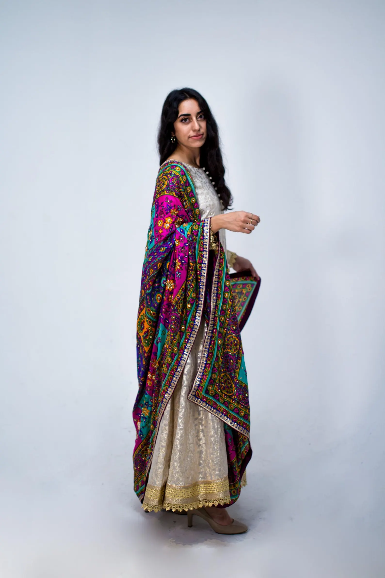 ✨ Turn every outfit into a statement with this luxurious multicolor silk dupatta, beautifully detailed with glass-shine sequins that sparkle with every movement. The vibrant patchwork-inspired print, paired with intricate embellishments, makes it a standout piece for any festive occasion.