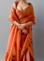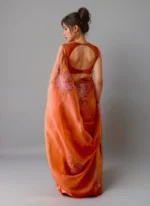- The orange silk blouse perfectly complements the saree offering a rich textural contrast to the airy organza. Made from high quality silk the blouse can be customized according to individual style preferences ensuring a flattering fit and personalized design. Whether you opt for a traditional cut or a modern silhouette the blouse promises to enhance the overall look of the ensemble. The minimalistic embellishments on the blouse echo the delicate detailing on the saree tying the entire outfit together seamlessly and creating a polished harmonious appeal.