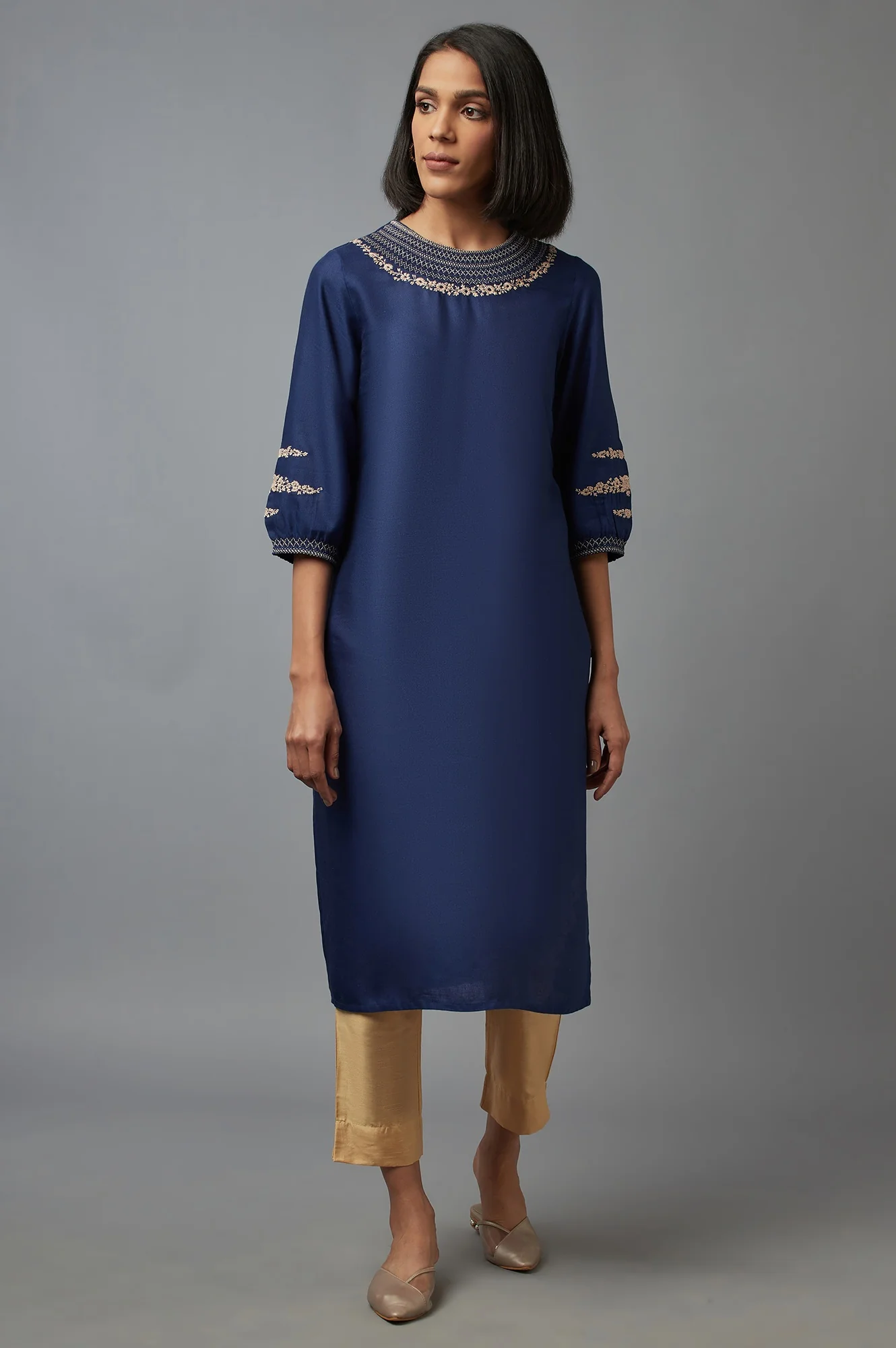 Cobalt Blue Embellished Elbow Sleeves Saree Blouse with Plunging V Neckline with Tasteful Royal Blue Gota Lace