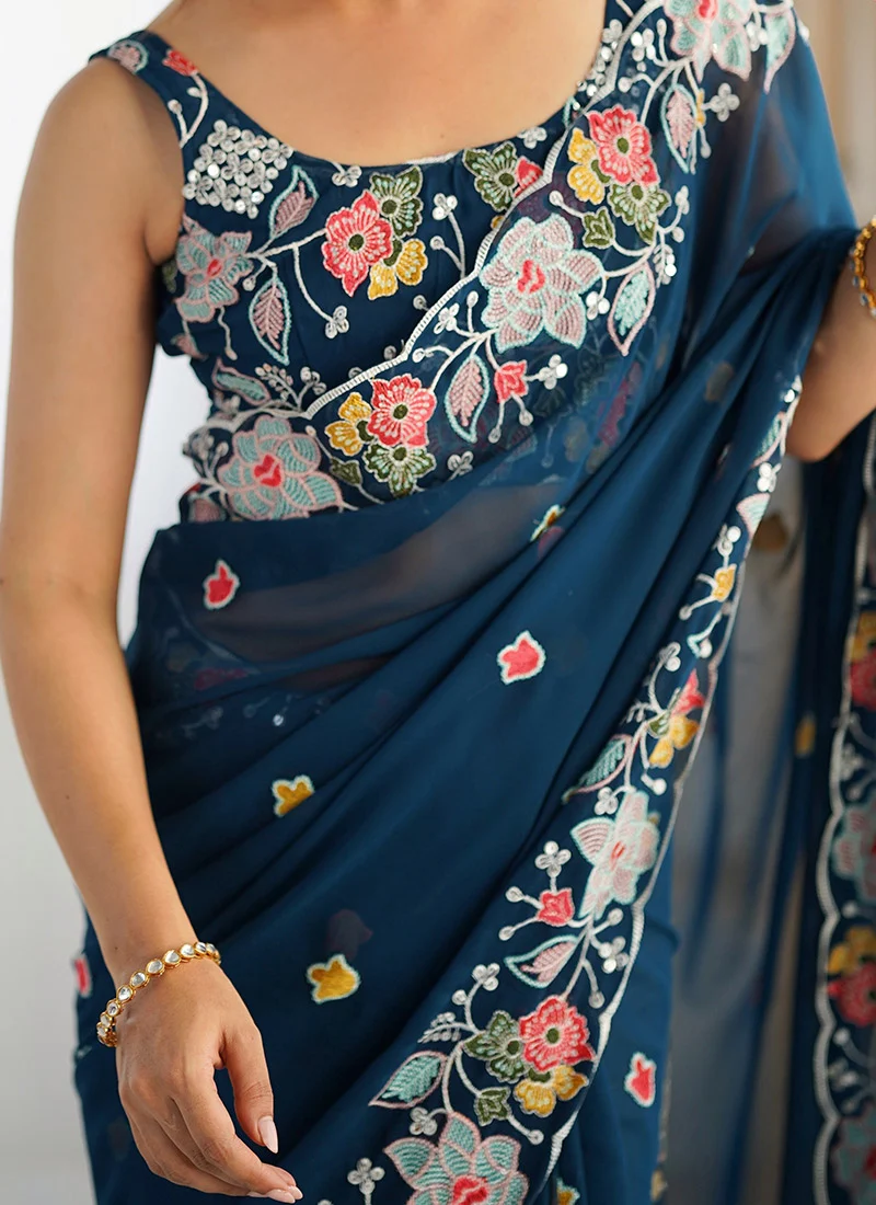 Home Saree Teal Georgette Embroidered Sequins Saree After Six Wear
