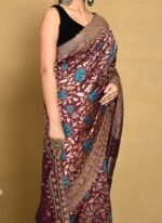• This exquisite winecolored Kancheepuram silk saree is a perfect blend of tradition and artistry showcasing the finest handembroidered craftsmanship. The saree is made from pure Kancheepuram silk renowned for its lustrous sheen and durable quality. The rich wine hue adds a touch of elegance making it ideal for grand occasions like weddings festivals or special celebrations. The entire saree is adorned with intricate handembroidered patterns showcasing floral motifs and traditional Indian designs creating a luxurious and regal appearance. The craftsmanship on the saree speaks volumes about the skill and dedication of the artisans who have meticulously worked on it making each stitch a piece of art. The embroidery adds depth and texture to the fabric enhancing its overall beauty and making it a showstopper wherever it is worn.