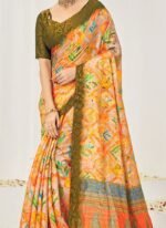 Women Jacquard Zari Woven Orange Digital Print Silk Saree With Blouse Festive Wear